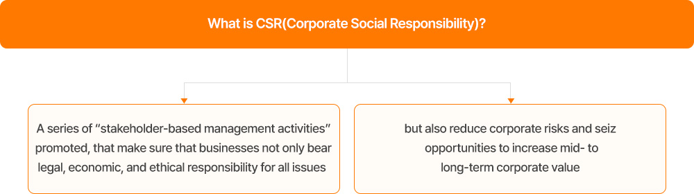 What is CSR(Corporate Social Responsibility)? A series of “stakeholder-based management activities” promoted, that make sure that businesses not only bear legal, economic, and ethical responsibility for all issues but also reduce corporate risks and seiz opportunities to increase mid- to long-term corporate value