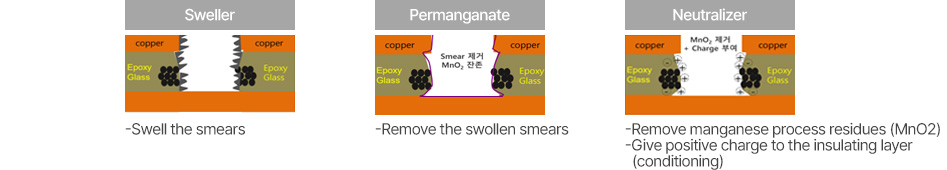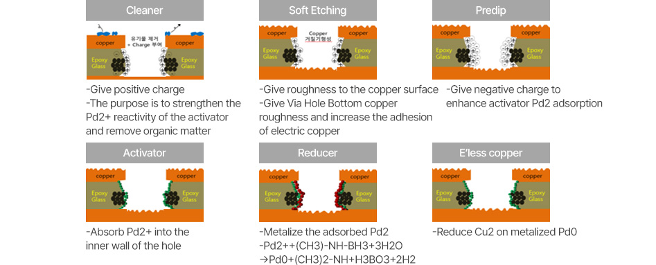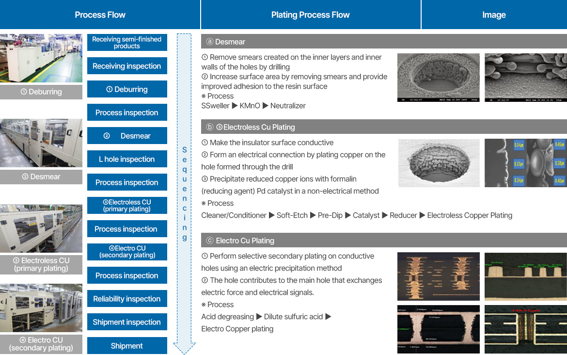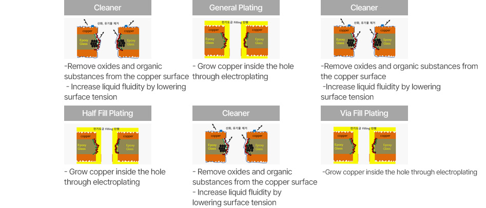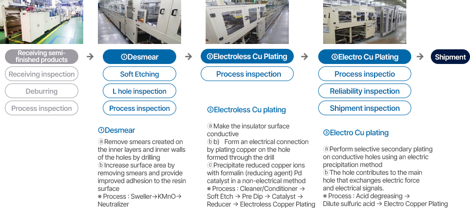 The CP Division receives semi-finished products from PCB manufacturers and uses its core technologies to implement copper plating of uniform thickness within the substrate and processed holes through the processes of ① desmear, ②electroless CU (primary), and ③ electro CU (secondary). INNOTRO has all the know-how for this.