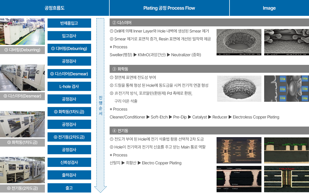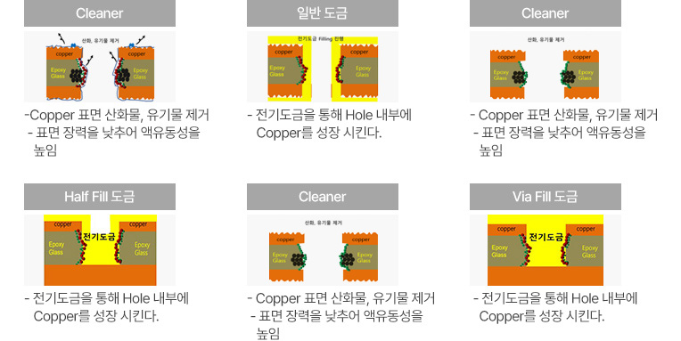 기판 및 가공된 홀 내에 균일한 두께의 동도금을 구현하는 것이 핵심 기술이며 이노트로는 이를 위한 제반 노하우를 보유하고 있습니다.