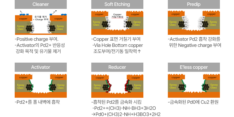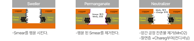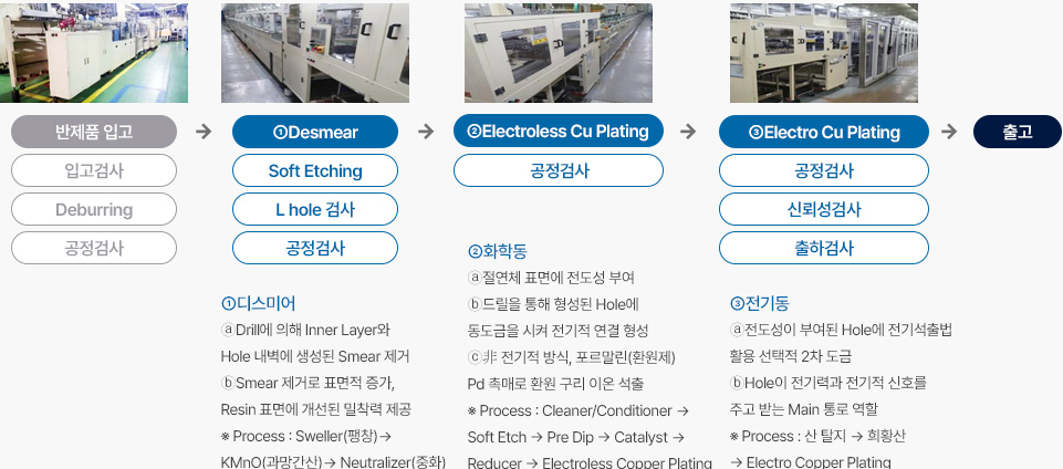 | 소프트에칭 | 디버링 | 디스미어 | 화학동 도금 | 전기동 도금 | 디스미어 | 화학동 도금 | 전기동 도금 | ||||